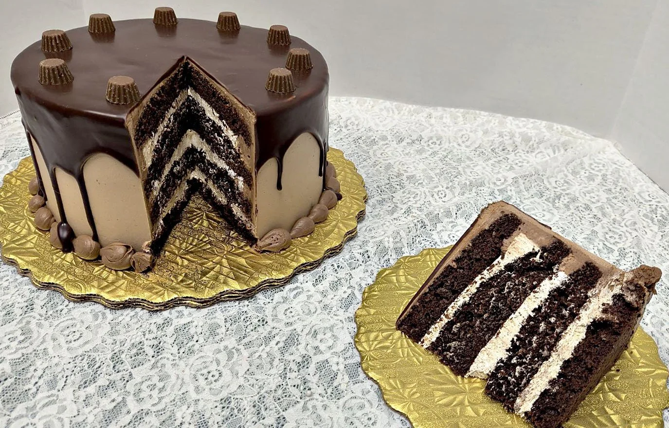 Chocolate peanut butter cake filled with soft and smooth peanut butter mousse, frosted in smooth chocolate peanut butter icing, drizzled with rich chocolate ganache, and topped with classic peanut butter cups.