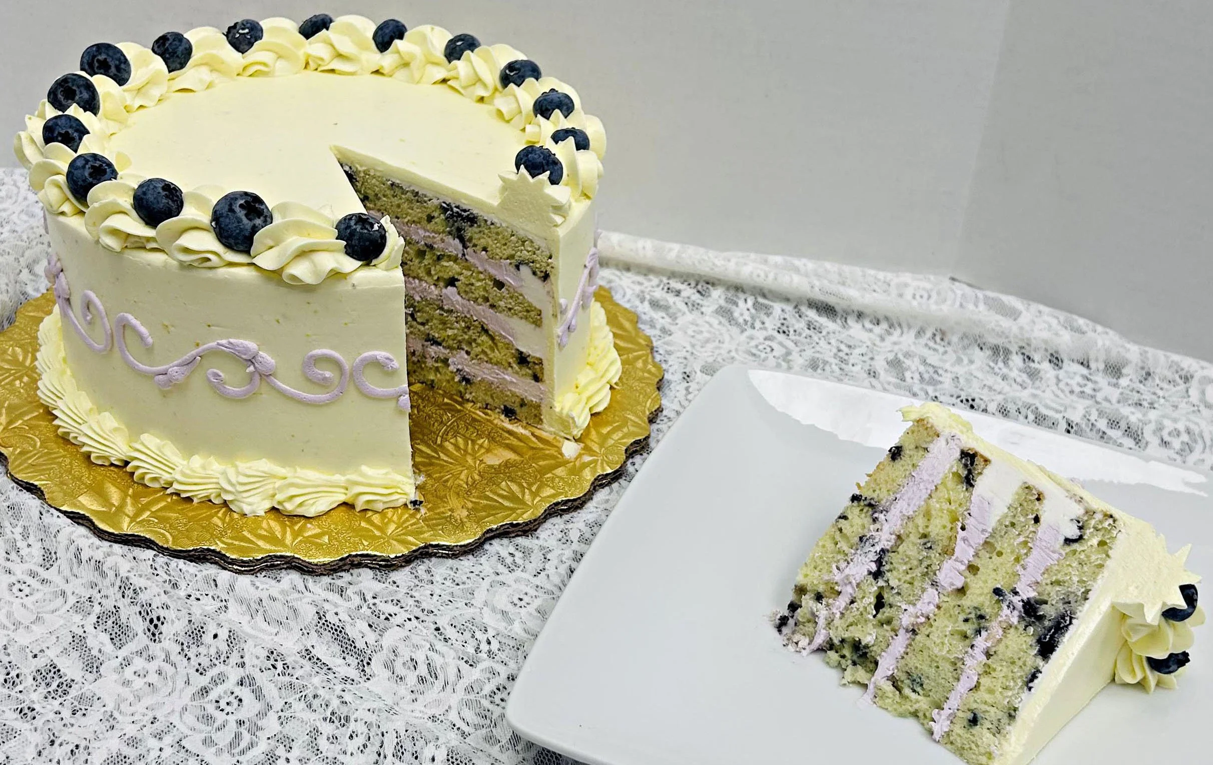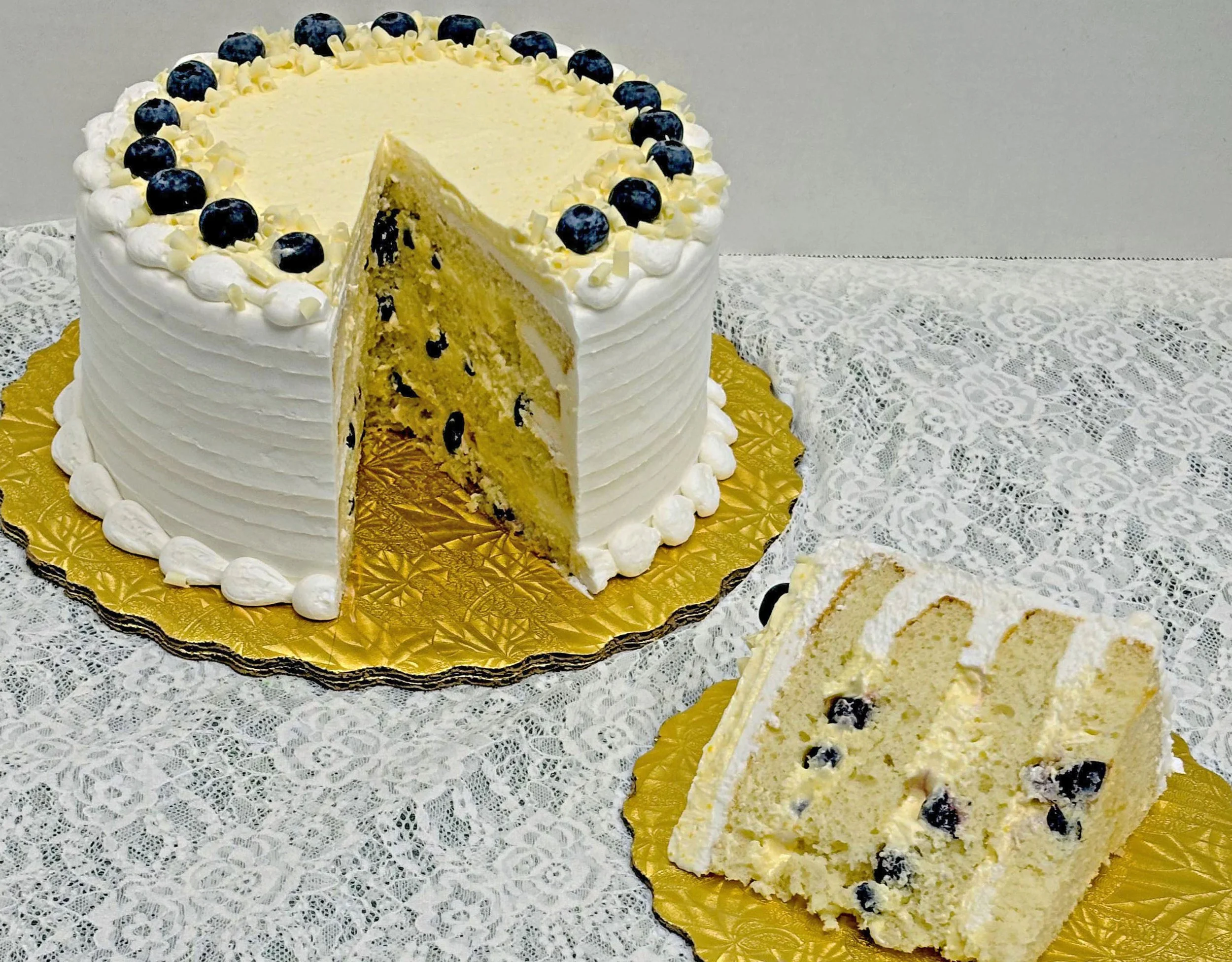 Zesty lemon cake baked with fresh blueberries, filled with smooth blueberry mousse, iced in a light blend of whipped and buttercream lemon icing, and finished with juicy blueberries and a crunchy streusel topping.