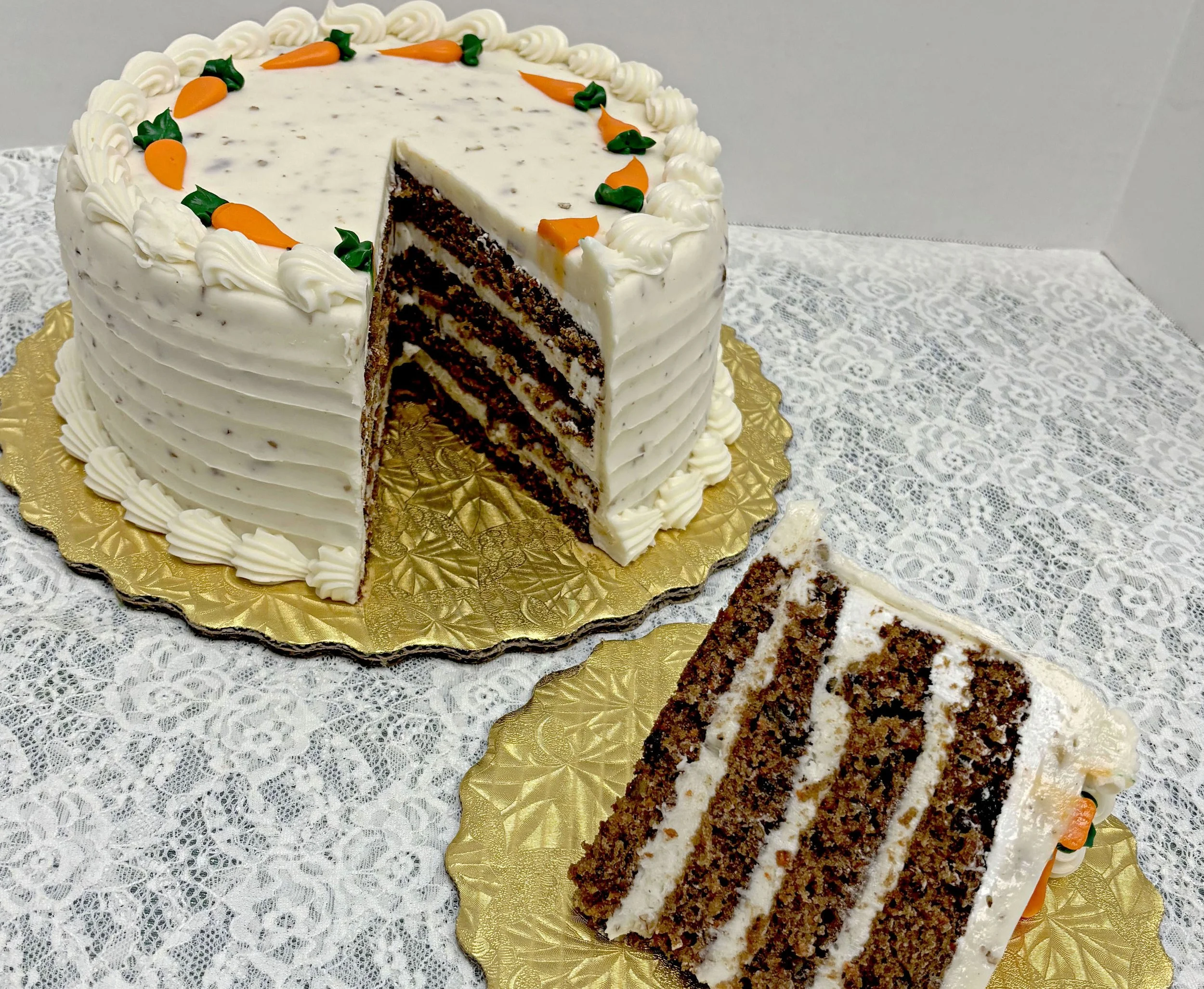 A sweet and moist carrot cake baked with plump raisins and crunchy walnuts, layered and iced with our smooth, sweet cream cheese frosting blended with chopped pecans, and finished with buttercream carrots on top.