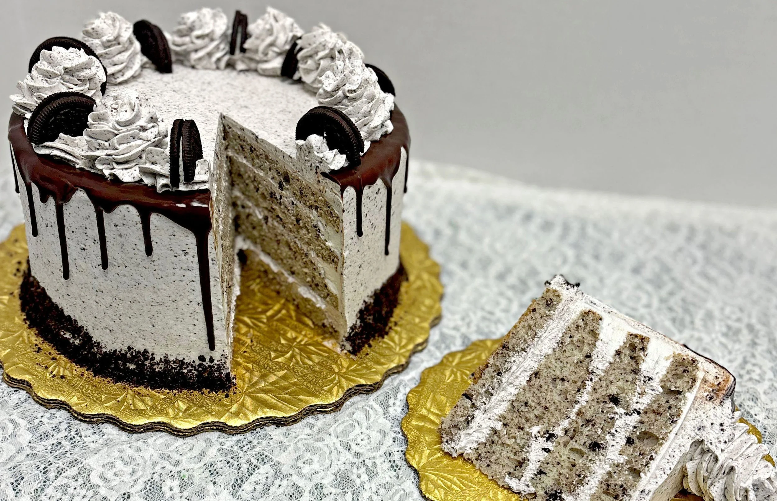 A moist white cake baked with chocolate cookie pieces, filled with cookies & crème mousse, coated in a sweet blend of cookie buttercream and whipped icing, and topped with chocolate curls and straws.