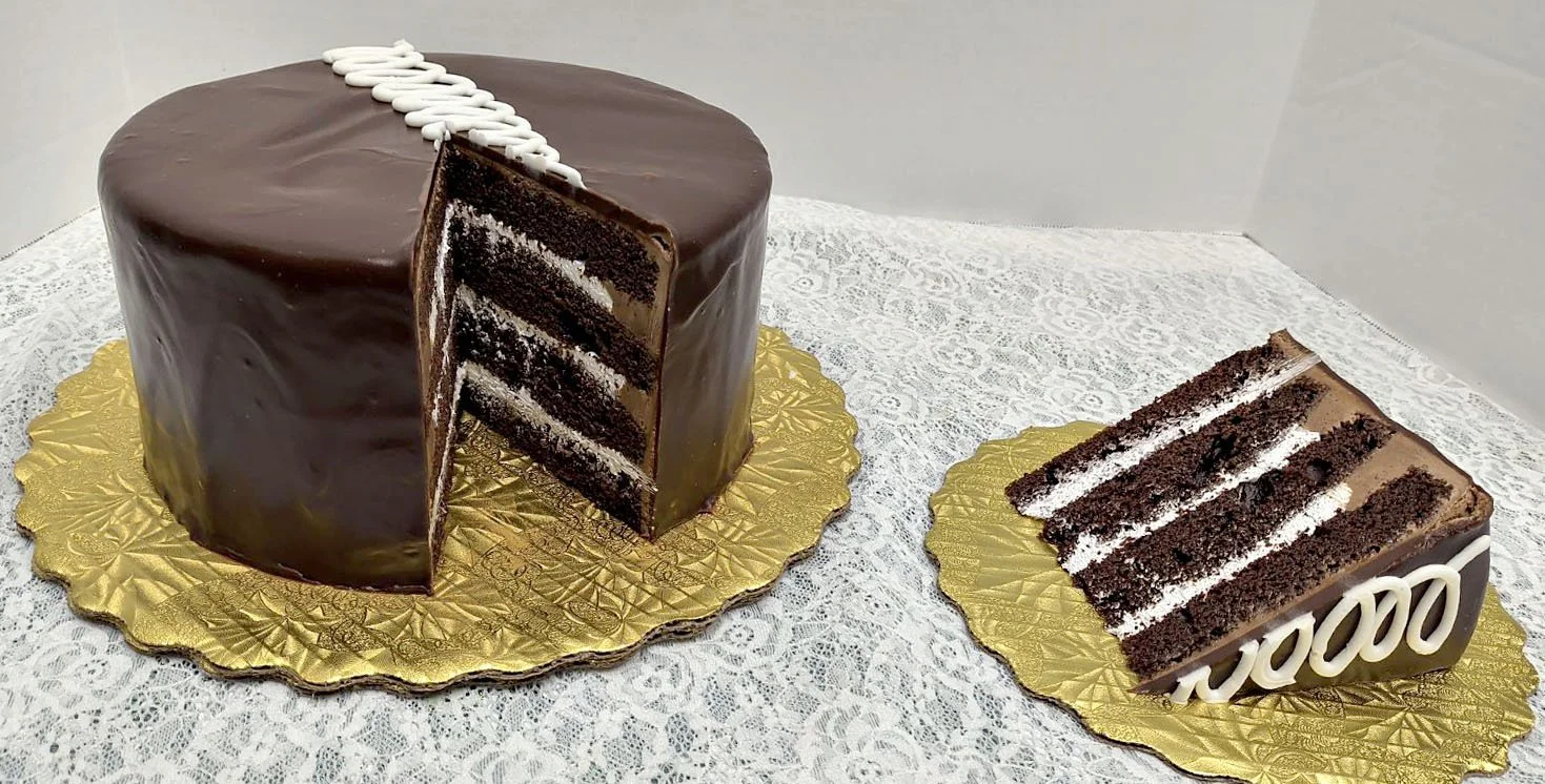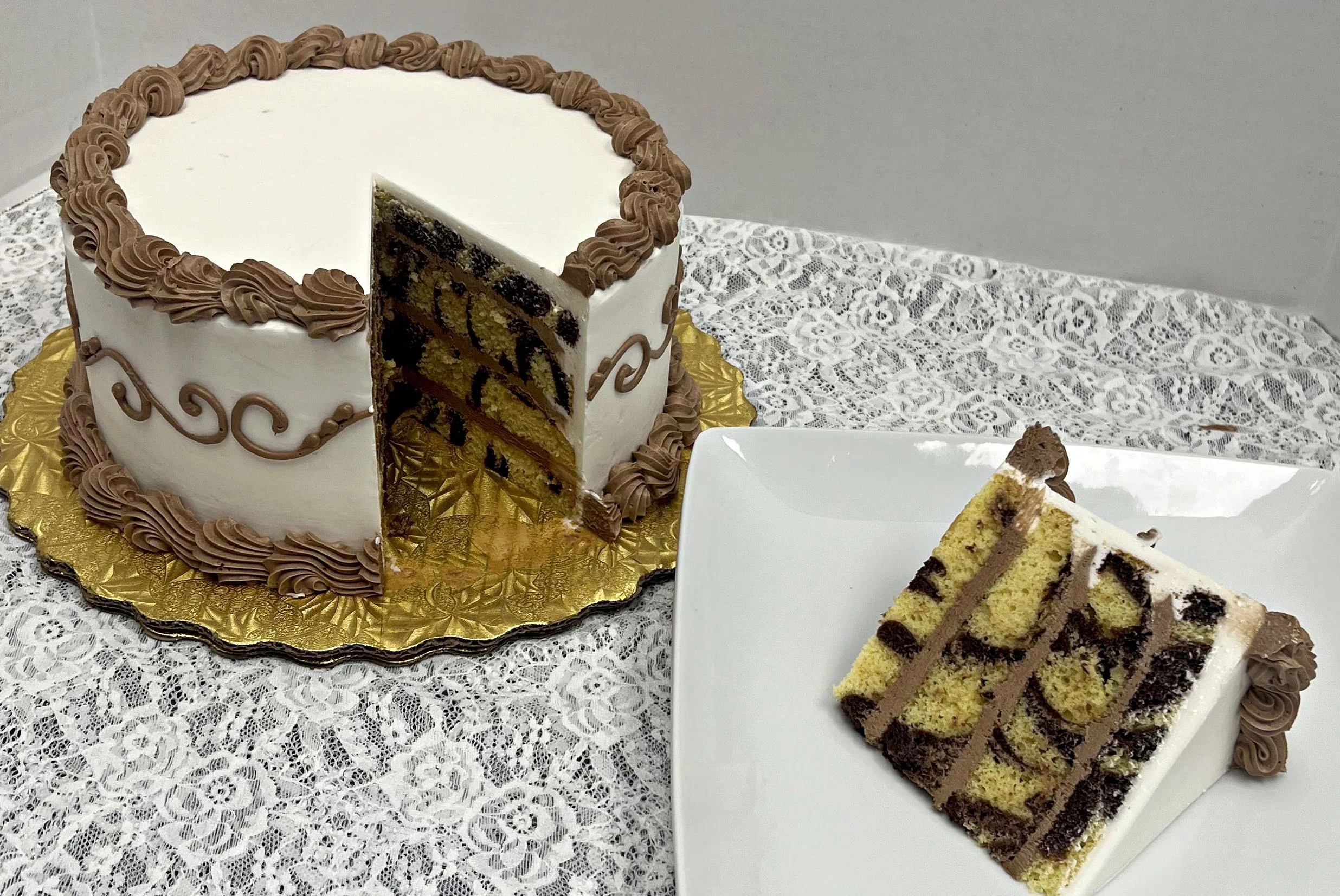 Our standard signature and gourmet cakes have four layers of cake with three layers of filling, excluding the 10-layer Torte. Our standard sizes include our 6” round that serves 6-8 and our 9” round that serves 14-16. Our short signature cakes have two layers of cake with one layer of filling. Our short sizes include our 6” round that serves 5-6 and our 9” round that serves 10-12. We also offer sheet cakes in the following sizes - 1/4 sheet that serves 24, 1/2 sheet that serves 48, 3/4 sheet that serves 72, and a full sheet that serves 96.