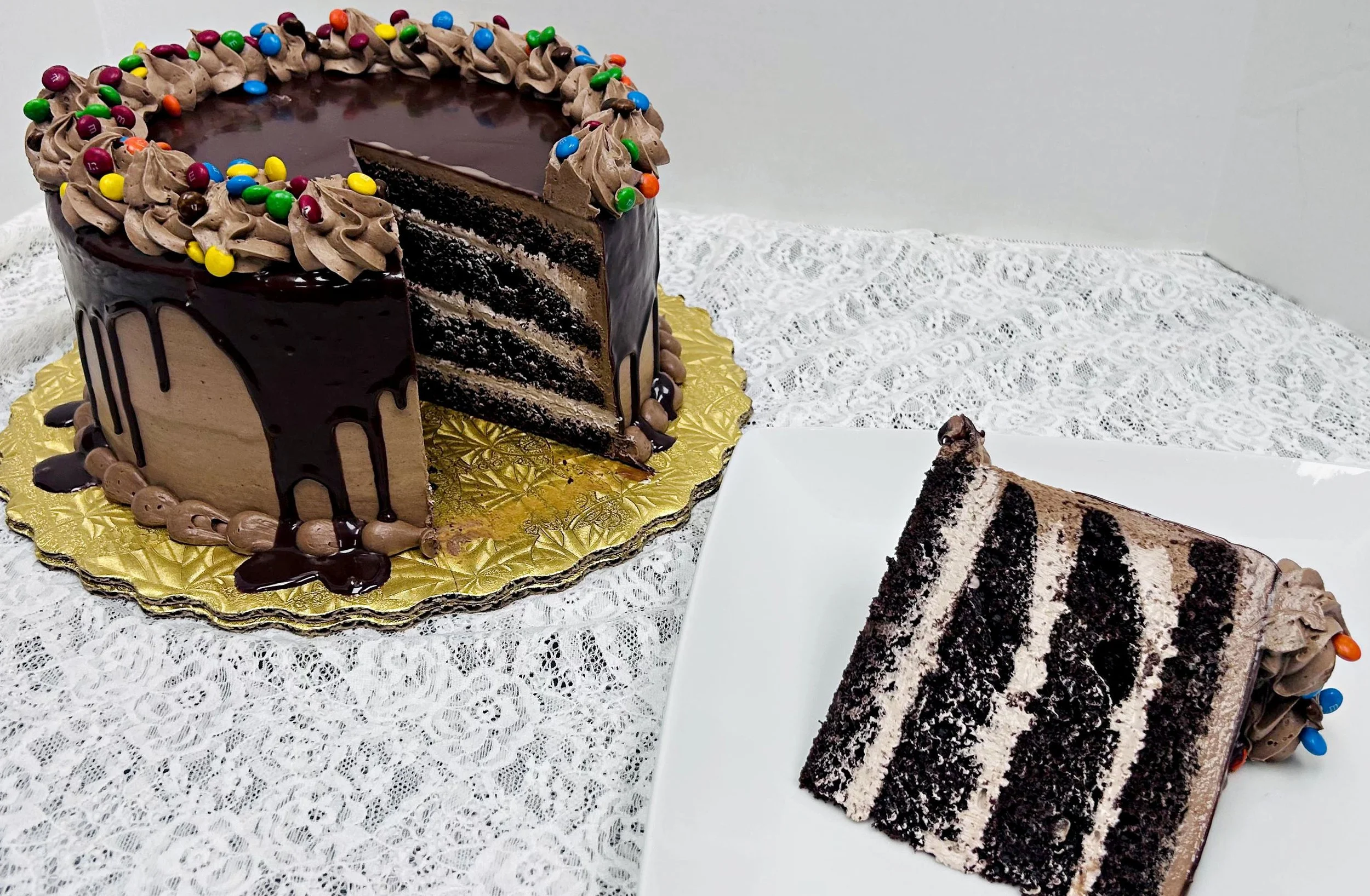 Chocolate caramel cake layered with decadent caramel ganache mousse, topped with rich chocolate ganache, and finished with a colorful sprinkle of M&M’s.