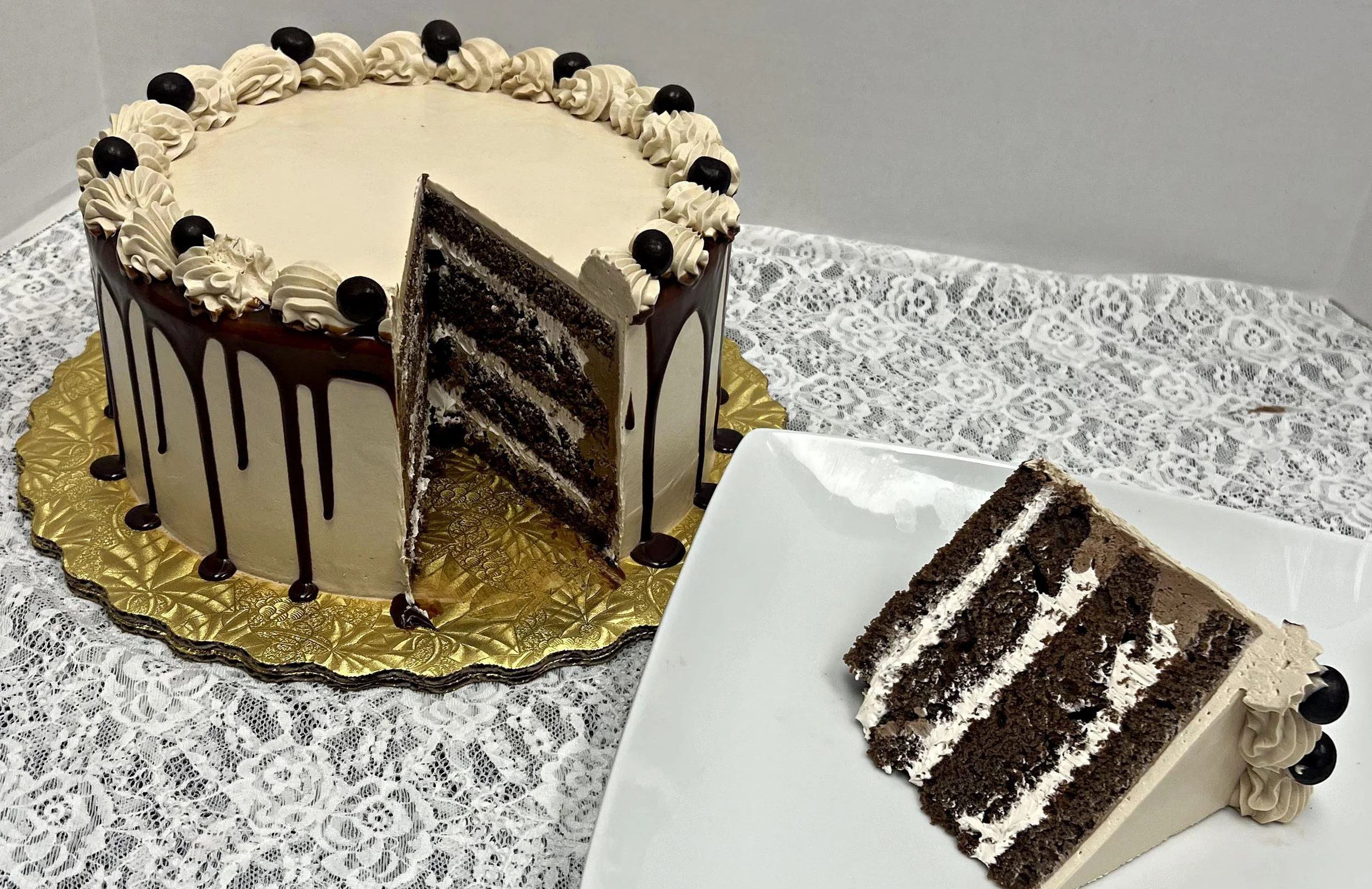 Our German chocolate cake is irresistibly soft and full of flavor! Layers are filled and iced with our signature German chocolate frosting, perfectly balanced with coconut and chopped pecans. The top is adorned with a rich chocolate ganache drip and chocolate curls, finished with a striking pool of ganache in the center and topped with bright Maraschino cherries for a classic, indulgent touch.