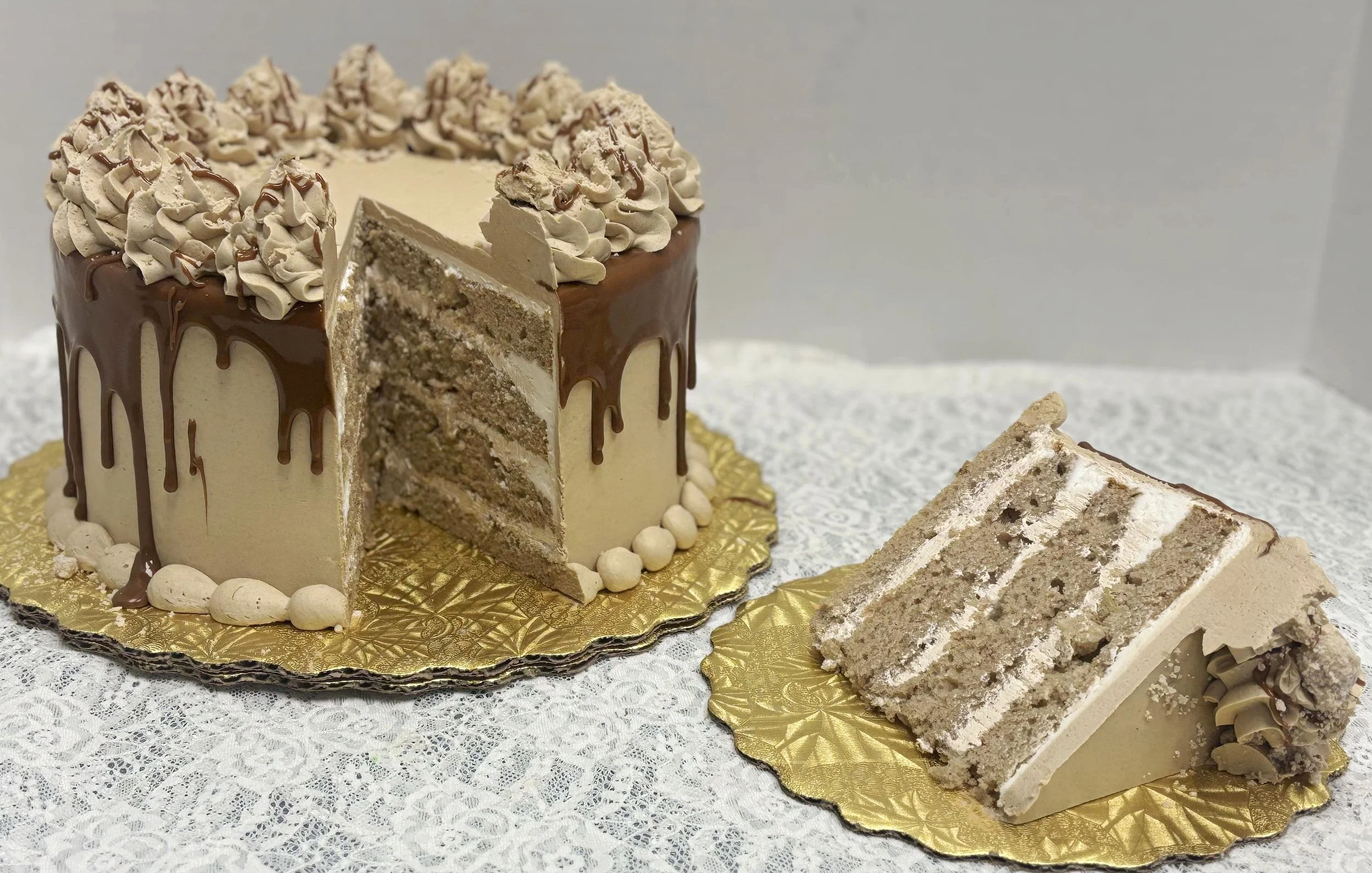 Our Italian crème cake is made with shredded coconut, and finely chopped pecans, which gives it a delicate texture and nutty sweetness. The cake layers are tender yet slightly dense, offering a perfect balance between light and indulgent. It’s filled and iced with tangy-smooth cream cheese filling mixed with crunchy pecans, and finished with a generous sprinkle of pecans on top and around the edges.