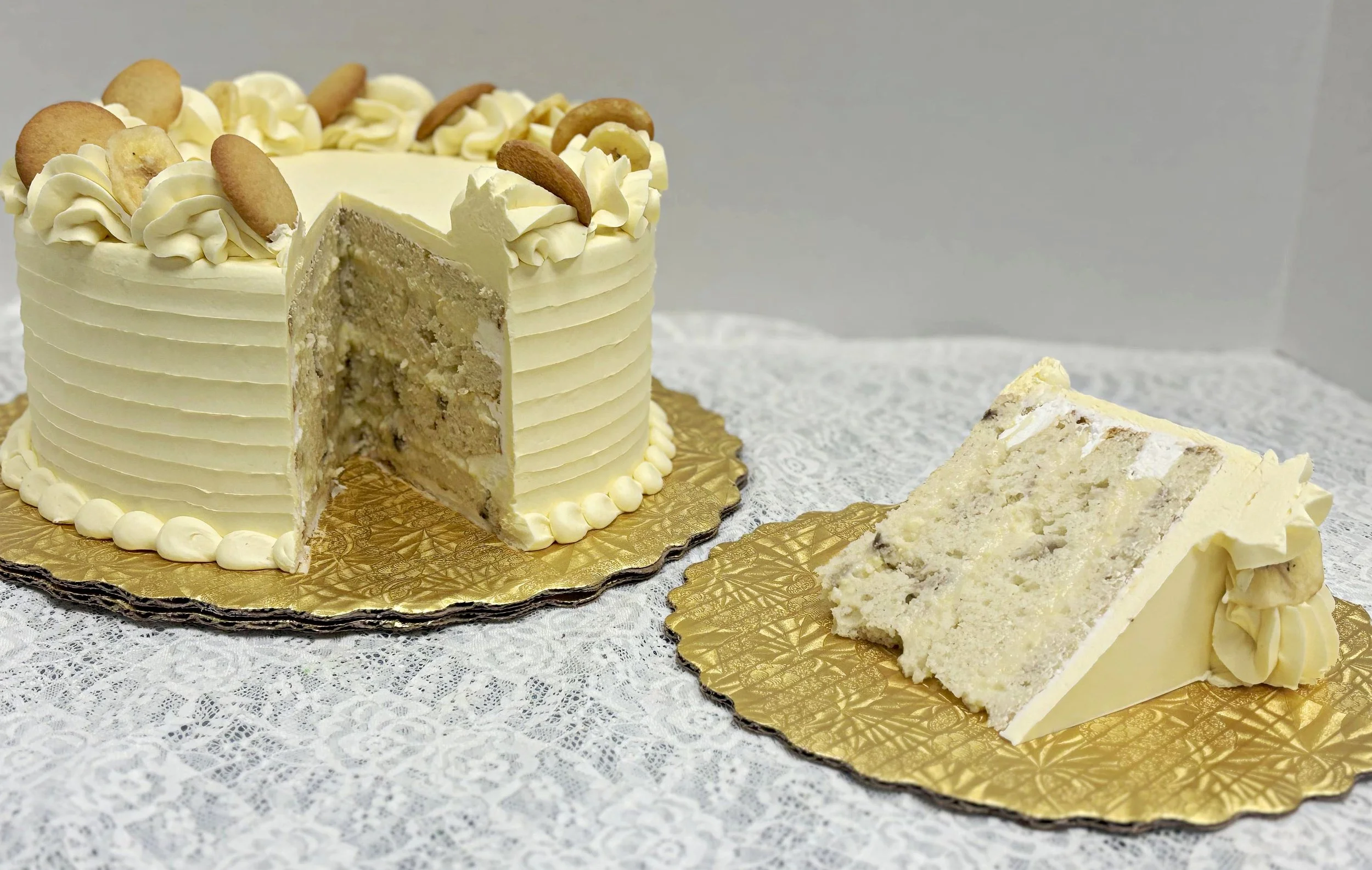 A moist banana cake layered with creamy banana pudding, frosted in a fluffy blend of whipped and buttercream banana icing, and topped with crunchy banana chips and classic vanilla wafers.