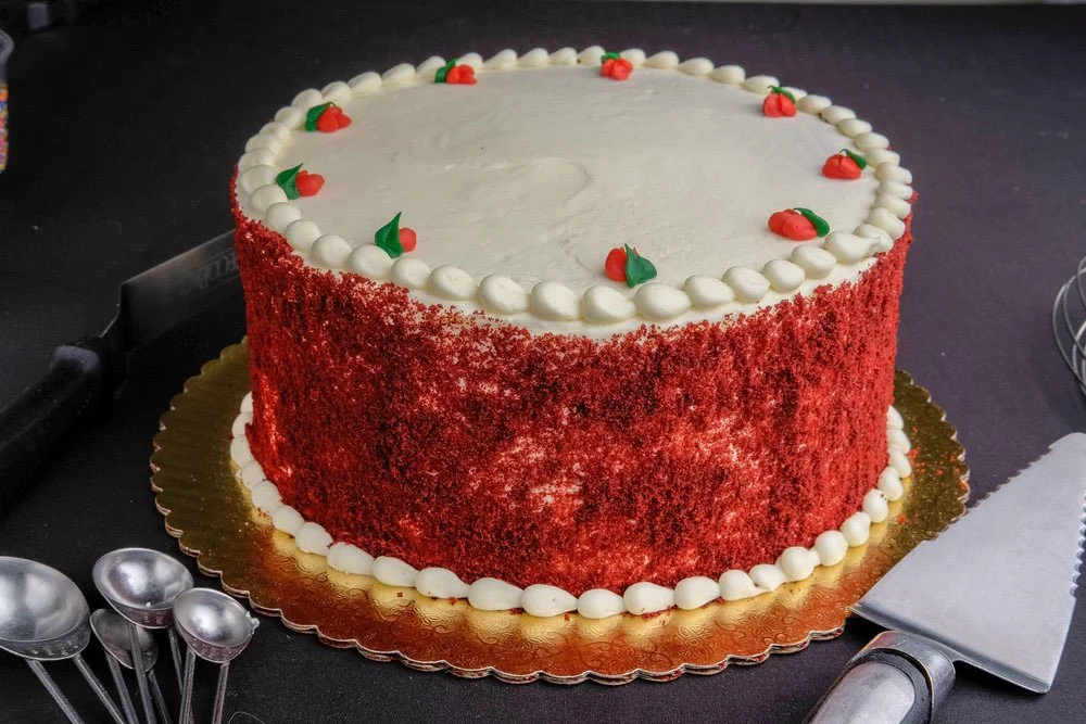 Our dark, rich, and fluffy Devil’s Food cake is the base for this classic cake. Layered with your choice of classic cream cheese or decadent chocolate mousse filling. Smooth, sweet cream cheese icing envelops the cake, with the sides coated in red velvet crumbs, and the top finished with your choice of elegant red rose buds or indulgent chocolate discs.
