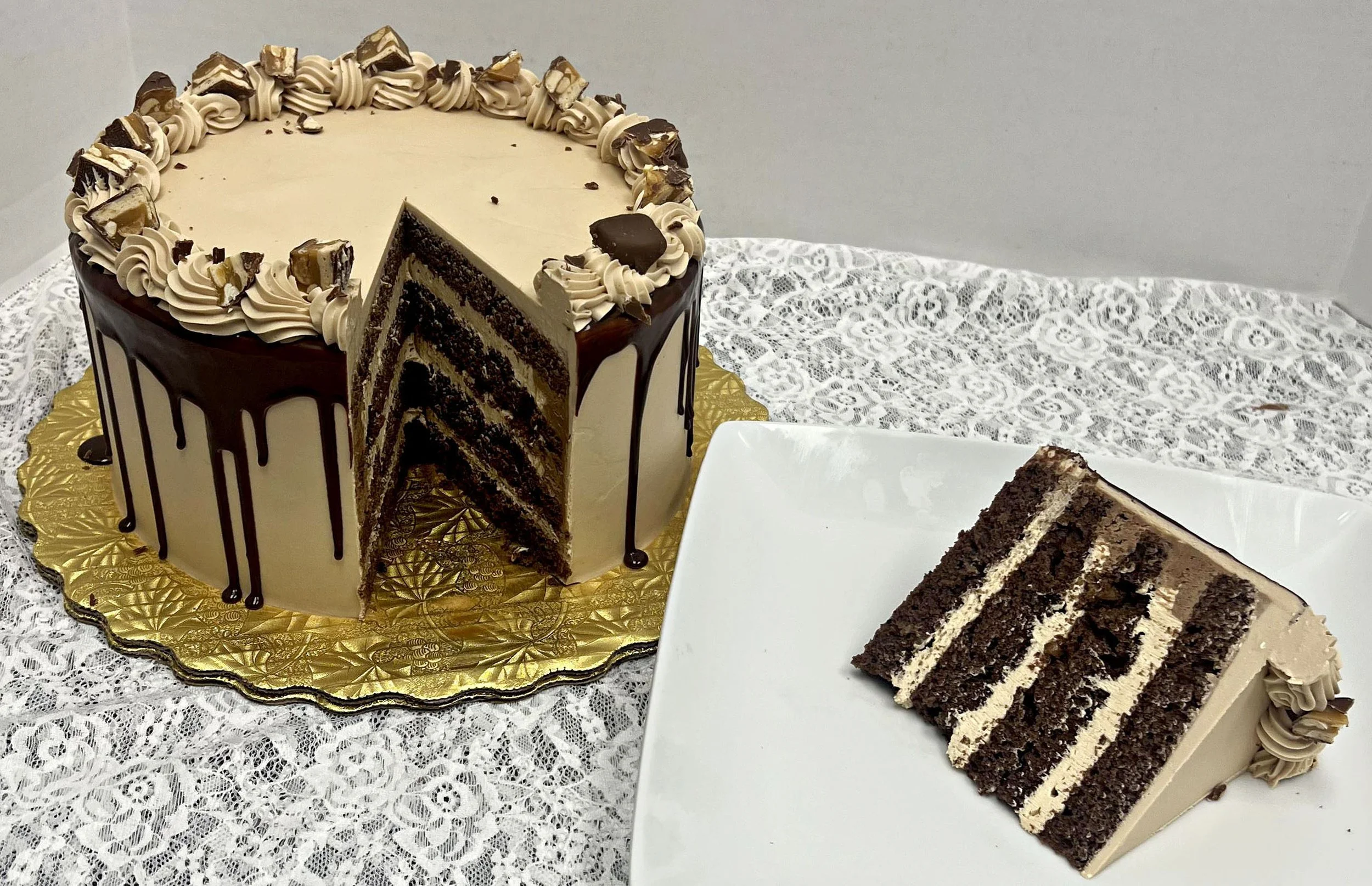 A rich chocolate peanut butter cake filled with smooth peanut butter mousse, frosted in smooth chocolate peanut butter icing, finished with chocolate ganache and peanut butter cups on top.